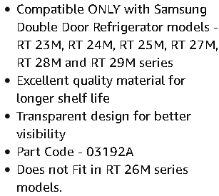 1. IT WILL BE FITTING AT SECOND LAST FROM BOTTOM SLOT OF REF DOOR. 2. IT IS ONLY FOR SAMSUNG DOUBLE DOOR FRIDGE OLD MODEL BEFORE 2010 ONLY. 3. IT IS COMPATIBLE FOR 250 LITRE TO 350 LITRE FRIDGE BUT SAMSUNG BRAND. 4. IT REPLACEMENT OF BOTTLE SHELF PART NO DA63-03192A MATCHED THEN ORDER. 5. IT COMPATIBLE MODEL ARE RT23M,RT24M, RT25M, RT27M,RT28M A fridge door bottle rack is an essential component of a refrigerator, designed to organize and securely hold bottles such as milk, juice, or wine on the refrigerator door. Typically made from durable materials like plastic or metal, these racks come in various sizes and configurations to accommodate different bottle types and refrigerator models.​ BuySpares Key Features: Material: Most bottle racks are constructed from sturdy plastic or metal to ensure longevity and support the weight of bottles.​ Design: They are designed to fit seamlessly into the door of the fridge, optimizing space and ensuring easy access to stored bottles.​ Dimensions: Sizes vary to fit different refrigerator models. For example, a standard rack might measure approximately 445 x 105 x 105 mm. ​ Darel+3BuySpares+3BuySpares+3 Compatibility: It's crucial to select a bottle rack compatible with your refrigerator's brand and model. Manufacturers often provide compatibility information to assist in choosing the correct rack.​ Darel+4BuySpares+4BuySpares+4 Benefits: Space Optimization: Properly organizing bottles on the door shelf frees up space on internal shelves for other items.​ Accessibility: Having bottles on the door allows for easy retrieval, especially for frequently used items.​ Safety: A secure bottle rack prevents bottles from tipping over or rolling, reducing the risk of spills and breakages.​ Replacement Considerations: